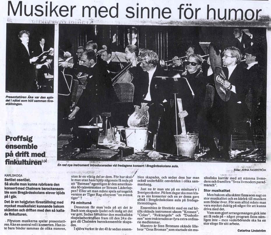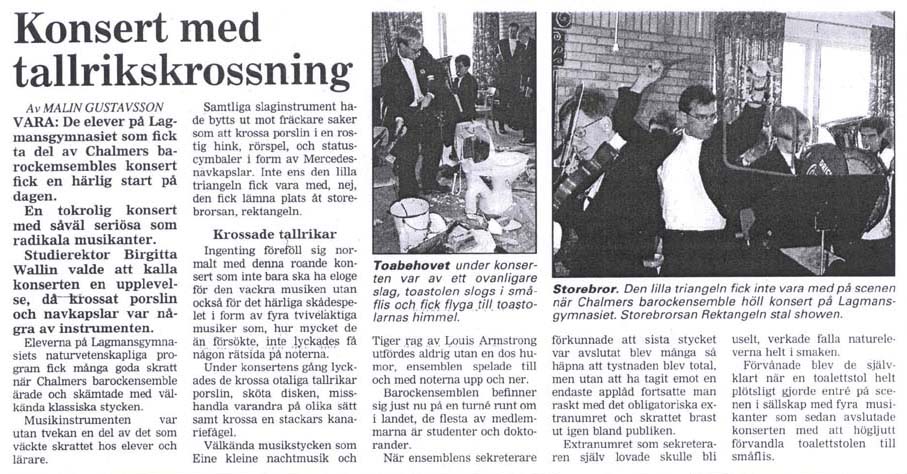 Vi har spelat på skolor och företag, fängelser och garnisoner - och vi gör det gärna igen. Vill du att vi ska spela hos just er, kontakta oss (info [vid] chalmersbarockensemble.se). Skriv vad det är för typ av musik ni söker och när ni skulle vilja att den uppfört så kan vårt presidium hjälpa er att få tag i det ni söker.Recensioner